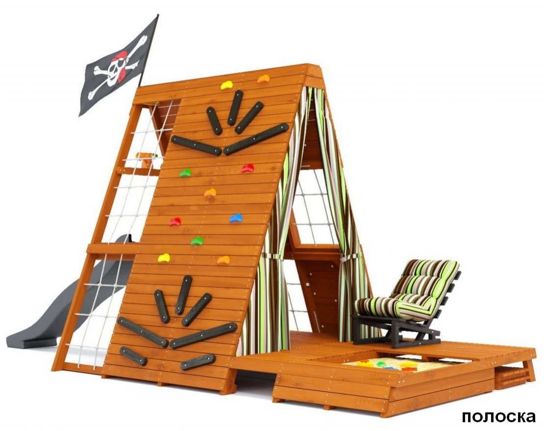- Пиратский флаг, кресло-лежак складное с 3 положениями спинки для детей и родителей, а также подушка с фиксаторами-липучками в красивом цвете – всё это поможет детям расслабиться после активной игры и создаст неповторимую атмосферу приключений и фантазии.