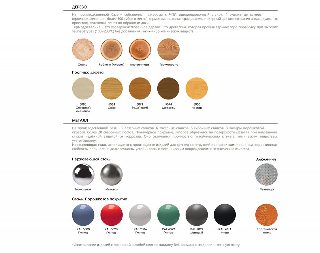 На производственной базе - 5 лазерных станков, 6 токарных станков, 5 гибочных станков, 3 камеры порошковой окраски, более 20 сварочных постов. Полимерное покрытие, которое образуется на поверхности металла при нагревании, служит надёжной защитой от коррозии. Оно отличается прочностью, устойчивостью к влаге, химическим веществам, ультрафиолету. Нержавеющая сталь используется в производстве изделий для детских конструкций по нескольким причинам: коррозионная стойкость, прочность и долговечность, устойчивость к механическим повреждениям и эстетические качества.
