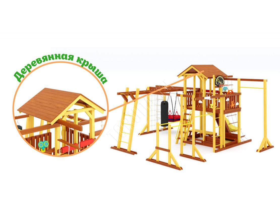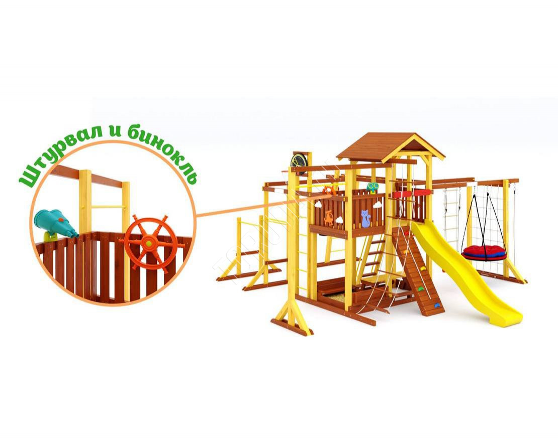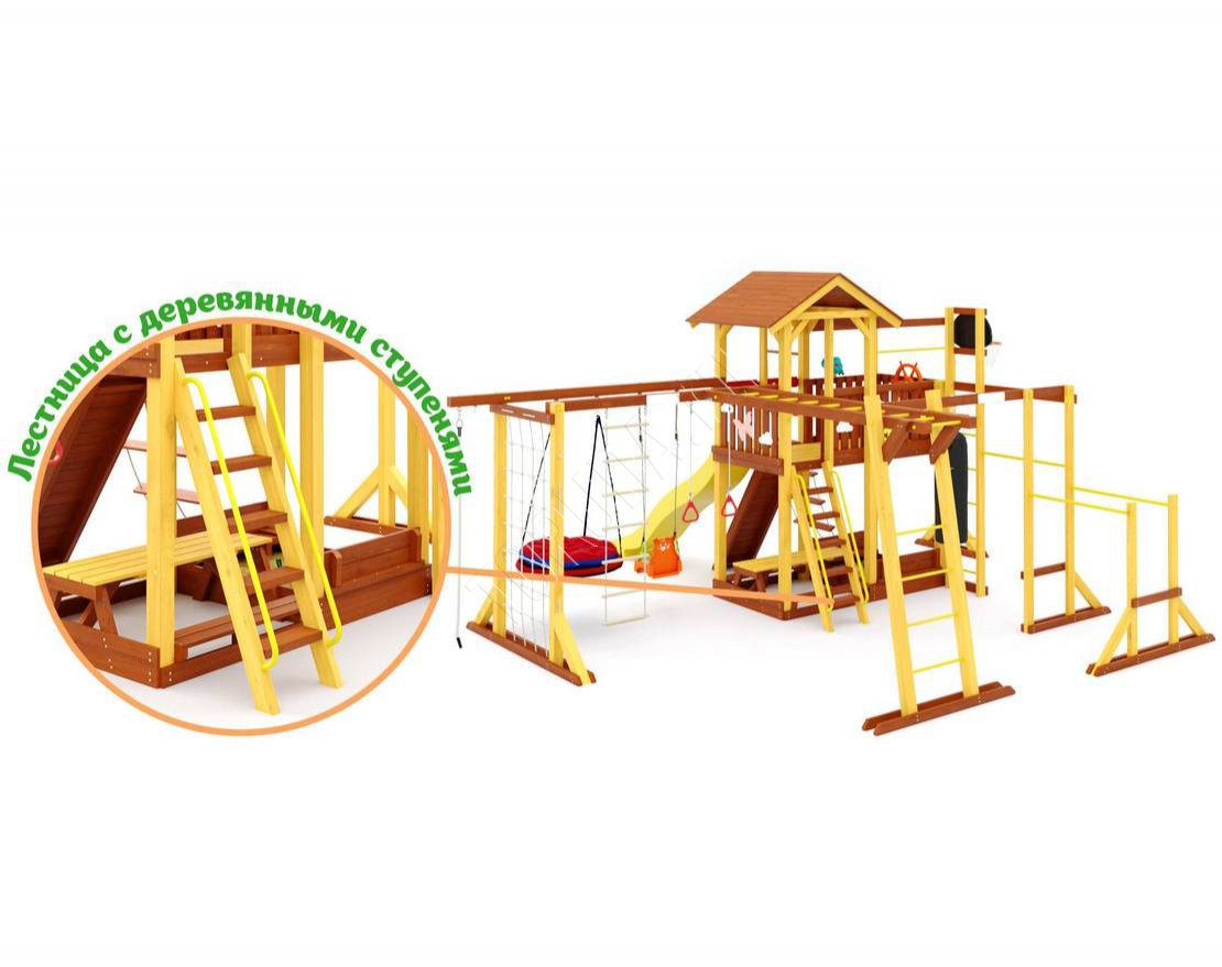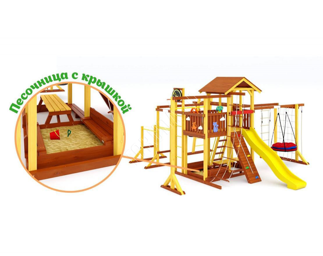 - Многообразие игровых элементов: в комплектацию входят скалодром, сетка-лазалка, турники, гимнастические кольца, песочница с крышкой, которая трансформируется в две лавочки, и многое другое.