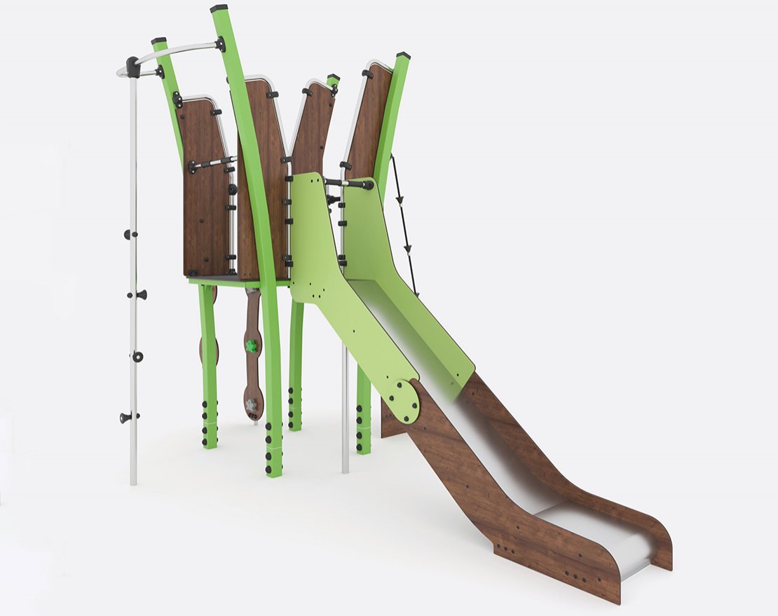 Состоит из металлической горки с пластиковыми защитными бортиками, канатной стропы, лестницы и металлических труб для лазания. Конструкция оснащена пластиковыми уступами, ручками и скалодромными зацепами.