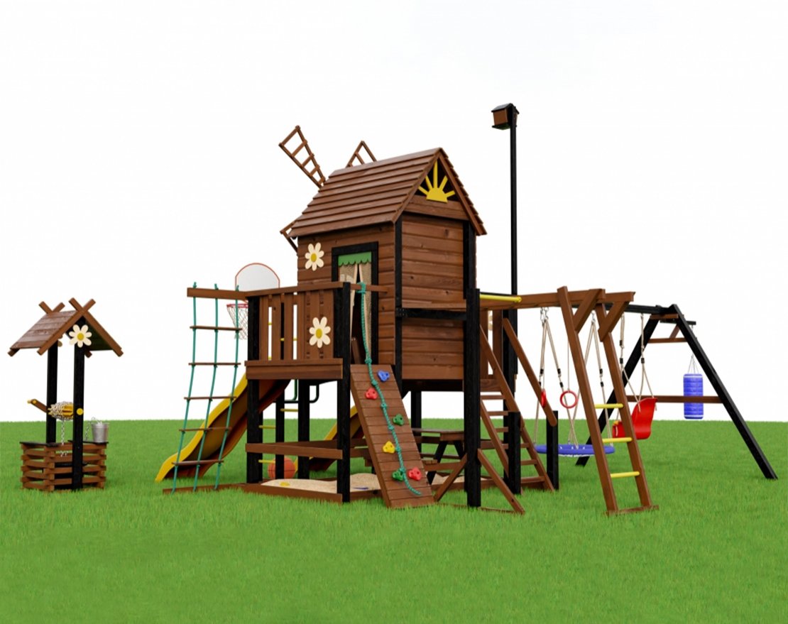 Игровой комплекс Мулен 3 с колодцем — это уютный деревянный домик, наполненный атмосферой приключений. Его узнаваемый силуэт с декоративными лопастями на крыше перенесет детей в мир сказок, где можно представить себя отважным путешественником, хозяином мельницы или капитаном воздушного корабля. Площадка сочетает различные игровые и спортивные элементы, помогая ребенку развивать ловкость, силу и координацию. Лестницы, канаты, качели и горка превращают игру в увлекательное приключение, в котором важно не только фантазировать, но и двигаться. Внутри домика продумано всё до мелочей — каждый уголок наполнен возможностями для игры, творчества и удобства. На втором этаже маленьких художников ждет доска для рисования, где можно воплощать свои фантазии. Два отдельных столика со стульчиками позволяют детям играть, рисовать или устраивать чаепитие, не мешая друг другу. А просторная песочница под домиком станет местом для совместных экспериментов с песочными замками — здесь хватит места всем! Два раздельных входа делают пространство более просторным и удобным, создавая еще больше возможностей для веселой и динамичной игры.