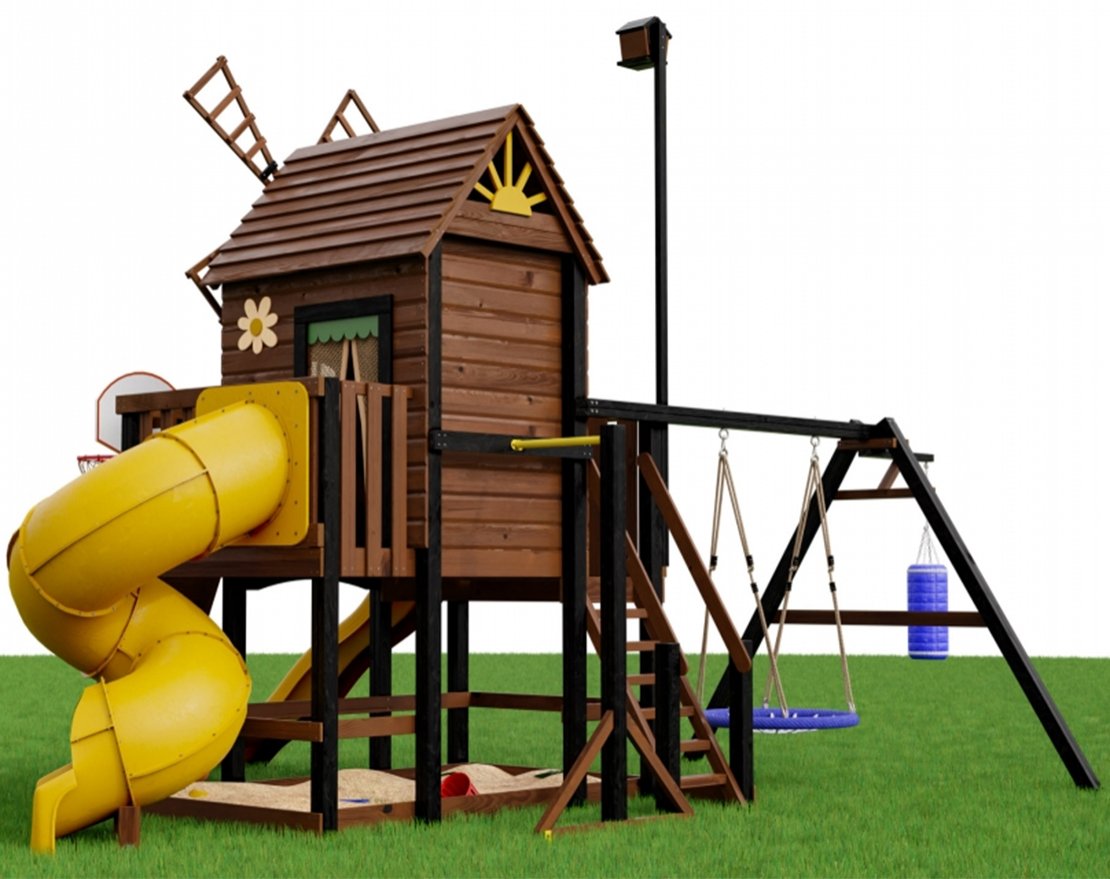 Игровой комплекс Мулен 4 с колодцем — это уютный деревянный домик, наполненный атмосферой приключений. Его узнаваемый силуэт с декоративными лопастями на крыше перенесет детей в мир сказок, где можно представить себя отважным путешественником, хозяином мельницы или капитаном воздушного корабля. Площадка сочетает различные игровые и спортивные элементы, помогая ребенку развивать ловкость, силу и координацию. Лестницы, канаты, качели и горка превращают игру в увлекательное приключение, в котором важно не только фантазировать, но и двигаться. Внутри домика продумано всё до мелочей — каждый уголок наполнен возможностями для игры, творчества и удобства. На втором этаже маленьких художников ждет доска для рисования, где можно воплощать свои фантазии. Два отдельных столика со стульчиками позволяют детям играть, рисовать или устраивать чаепитие, не мешая друг другу. А просторная песочница под домиком станет местом для совместных экспериментов с песочными замками — здесь хватит места всем! Два раздельных входа делают пространство более просторным и удобным, создавая еще больше возможностей для веселой и динамичной игры.