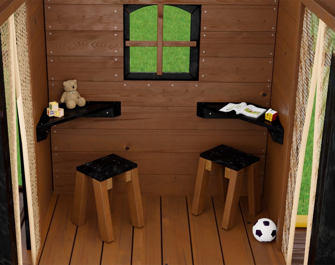 Игровой комплекс Мулен 5 с колодцем — это уютный деревянный домик, наполненный атмосферой приключений. Его узнаваемый силуэт с декоративными лопастями на крыше перенесет детей в мир сказок, где можно представить себя отважным путешественником, хозяином мельницы или капитаном воздушного корабля. Площадка сочетает различные игровые и спортивные элементы, помогая ребенку развивать ловкость, силу и координацию. Лестницы, канаты, качели и горка превращают игру в увлекательное приключение, в котором важно не только фантазировать, но и двигаться. Внутри домика продумано всё до мелочей — каждый уголок наполнен возможностями для игры, творчества и удобства. На втором этаже маленьких художников ждет доска для рисования, где можно воплощать свои фантазии. Два отдельных столика со стульчиками позволяют детям играть, рисовать или устраивать чаепитие, не мешая друг другу. А просторная песочница под домиком станет местом для совместных экспериментов с песочными замками — здесь хватит места всем! Два раздельных входа делают пространство более просторным и удобным, создавая еще больше возможностей для веселой и динамичной игры.