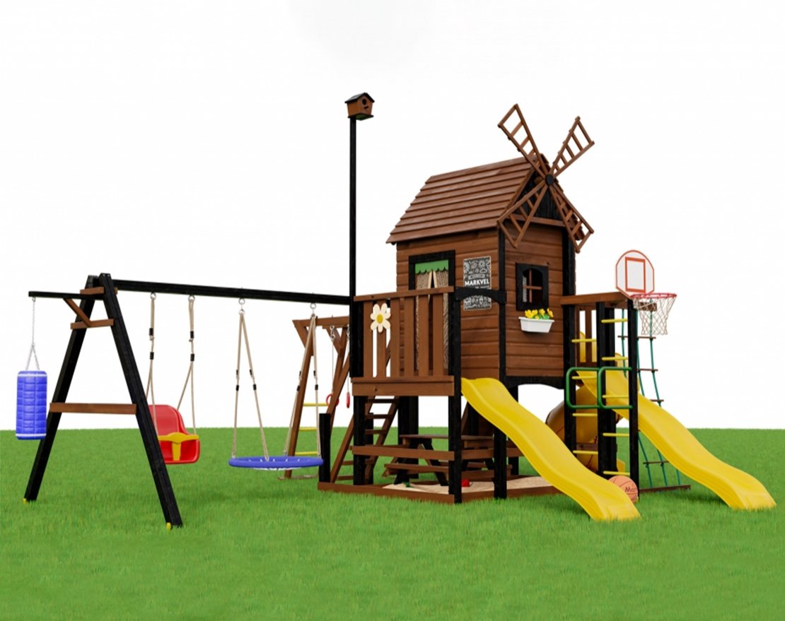 Игровой комплекс Мулен 6 — это уютный деревянный домик, наполненный атмосферой приключений. Его узнаваемый силуэт с декоративными лопастями на крыше перенесет детей в мир сказок, где можно представить себя отважным путешественником, хозяином мельницы или капитаном воздушного корабля. Площадка сочетает различные игровые и спортивные элементы, помогая ребенку развивать ловкость, силу и координацию. Лестницы, канаты, качели и горка превращают игру в увлекательное приключение, в котором важно не только фантазировать, но и двигаться. Внутри домика продумано всё до мелочей — каждый уголок наполнен возможностями для игры, творчества и удобства. На втором этаже маленьких художников ждет доска для рисования, где можно воплощать свои фантазии. Два отдельных столика со стульчиками позволяют детям играть, рисовать или устраивать чаепитие, не мешая друг другу. А просторная песочница под домиком станет местом для совместных экспериментов с песочными замками — здесь хватит места всем! Два раздельных входа делают пространство более просторным и удобным, создавая еще больше возможностей для веселой и динамичной игры.