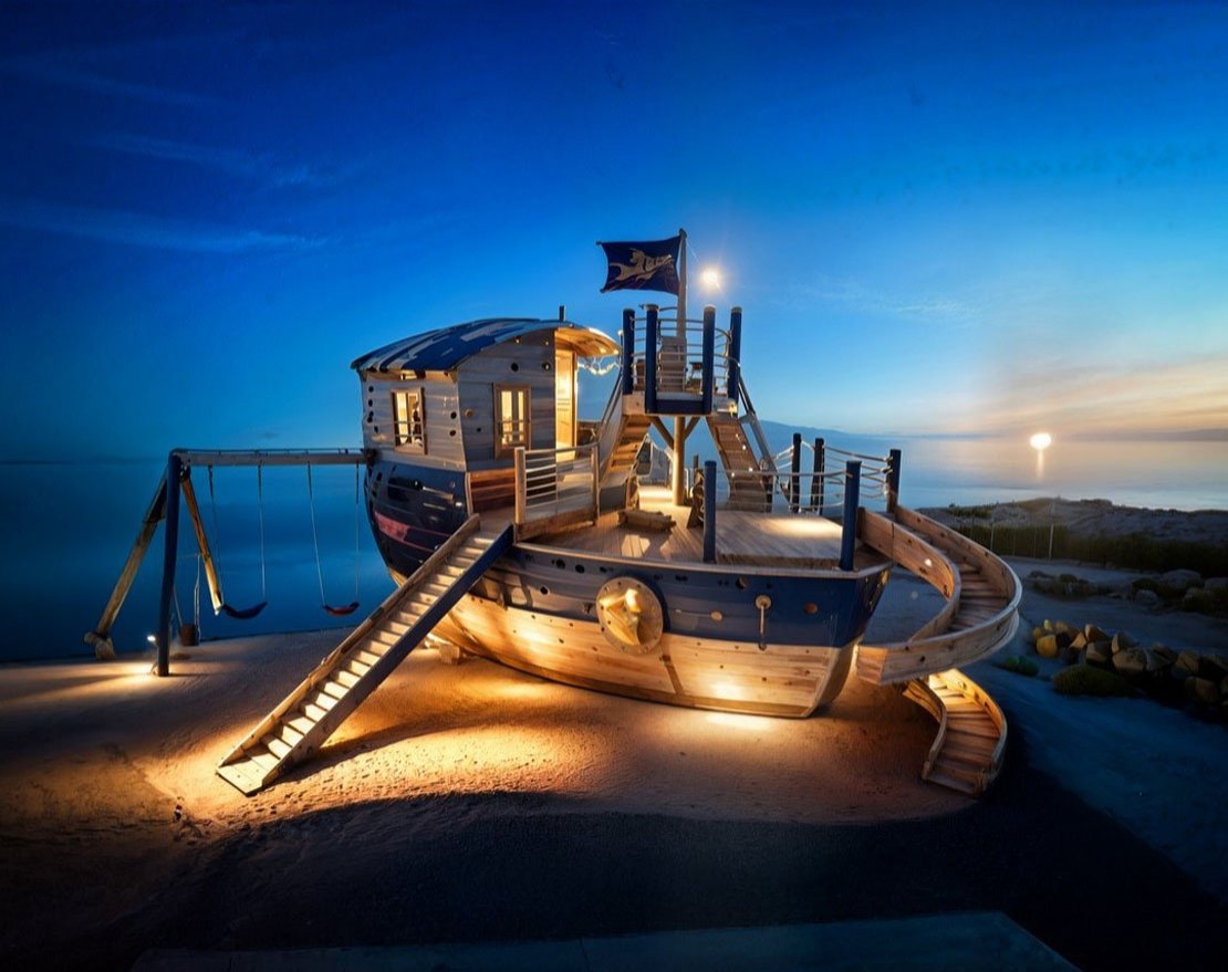 Воронье гнездо – это наблюдательный пост с 2 лесенками. Он соединяет нос и корму корабля. К мачте можно привязать флаг. На втором этаже установлены 2 люка для спуска и подъёма. Также есть обычная лестница, по которой можно безопасно подняться в верхнюю комнату. К корпусу комплекса крепится перекладина для подвесных качелей.