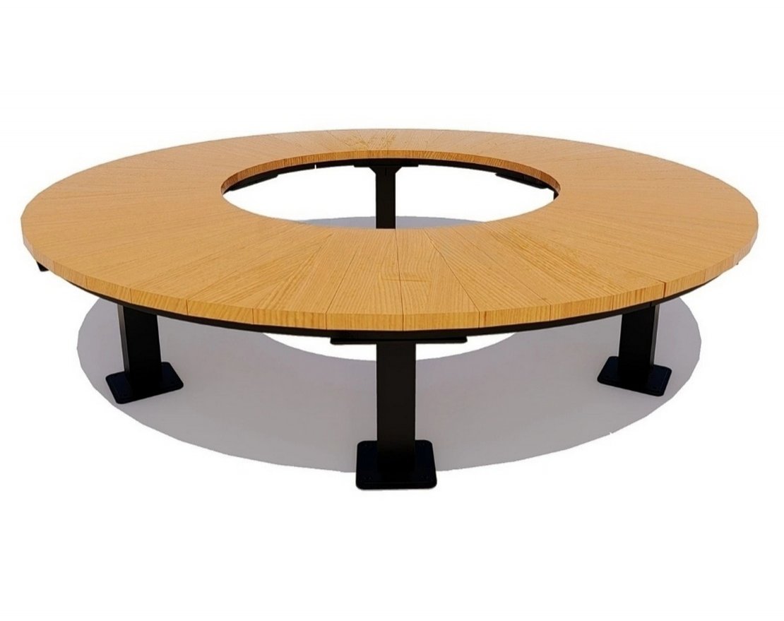 «Смоленск» — необычная скамейка из натурального дерева с эффектной тонировкой. Модель сочетает оригинальный дизайн с практичностью и вместительностью. Опоры конструкции стальные, окрашены методом порошкового напыления. При необходимости их можно зафиксировать на грунте анкерными болтами. Сиденье нестандартной круговой формы составлено из брусьев. Ширина его составляет 500 мм, что способствует комфорту сидящих.