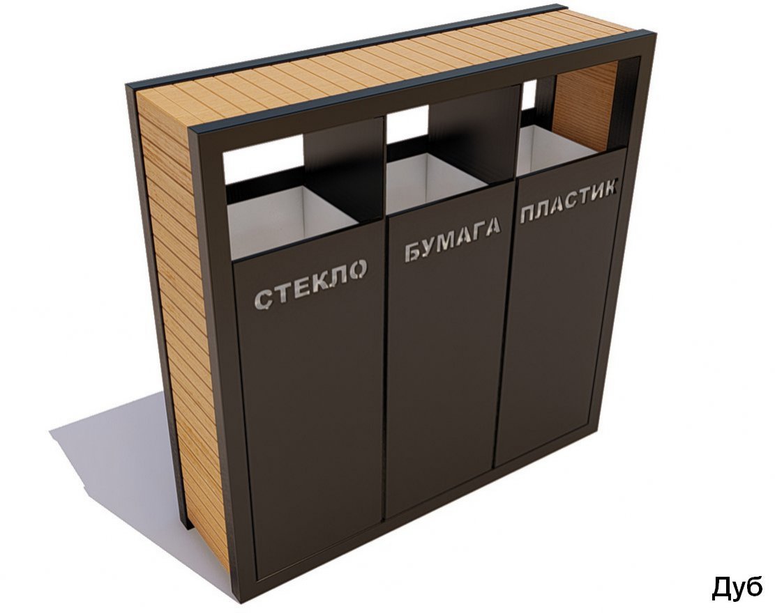 Урны для раздельного сбора мусора — идеальное решение при создании современной городской среды, где люди заботятся об экологии и будущем планеты. Основа конструкции выполнена из листовой стали с прочным лакокрасочным покрытием, устойчивым к уличной эксплуатации. Верхняя часть корпуса изготовлена из натурального дерева, обработанного защитной пропиткой и лаком. Урна включает в себя 3 высоких контейнера квадратного сечения. Они предназначены для стекла, пластика и бумаги, о чем имеются соответствующие контрастные надписи. Модель популярна при благоустройстве парковых и лесопарковых зон, дворов, площадей, набережных.
