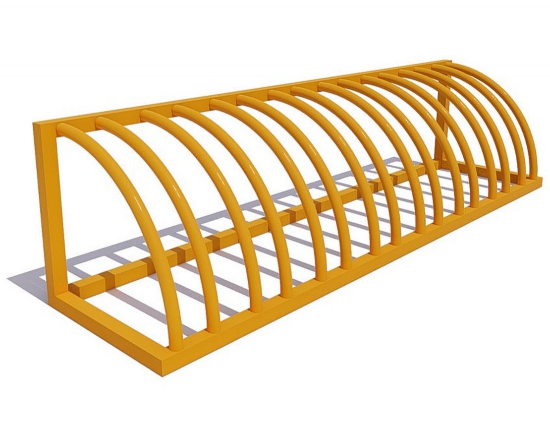 Велопарковка – это стальная конструкция с массивным прямоугольным основанием. Ячейки имеют полукруглую форму, секции для велосипедов чередуются с узкими разделительными блоками. Конструкция отличается небольшими размерами, легко умещается вдоль стен за счет плоской каркасной части сзади и устойчива на любой поверхности. Для окраски используется специальное износоустойчивое покрытие. Сплошные элементы отсутствуют, поверхность легко моется и не выцветает на солнце. За счет массивного основания парковка не требует закрепления, практична и удобна в использовании.
