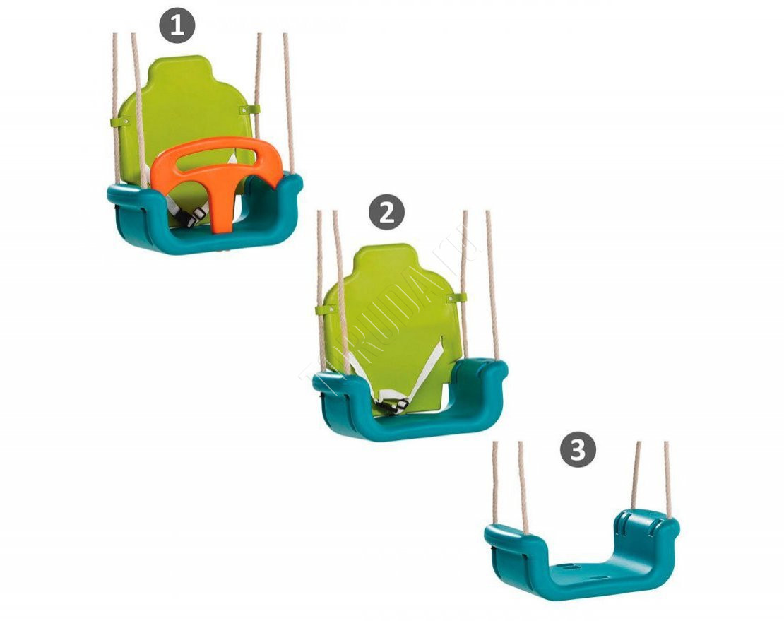 Детские качели изменяются по мере роста ребёнка от детской версии с дополнительными страхующими элементами до стандартного сиденья для качелей. Более того, задняя спинка имеет два положения. Продукт имеет страховой ремень с пряжкой, которая кликает во время срабатывания. Кольца и восьмёрки изготовлены из оцинкованной стали. Уэлды на верёвке изготовлены из чёрного пластика.